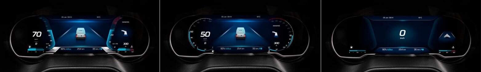 Der Daily hebt sich durch sein serienmäßiges 10 Zoll großes Kombi-Instrument von der Masse ab. Die Informationen zum Fahrzeug werden übersichtlich und in großer Schrift auf dem Breitbild-Display dargestellt. Fahrer haben die Wahl zwischen drei Designs, die sich per Schalter ganz einfach umstellen lassen. Bei Modellen ohne Infotainment oder DAB Radio wird die Ansicht der Rückfahrkamera angezeigt, wenn der Rückwärtsgang eingelegt wird.