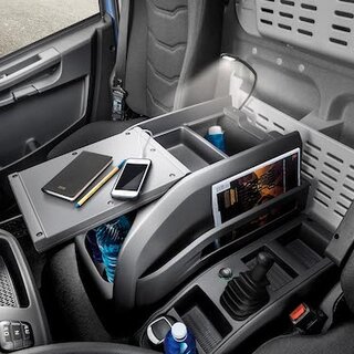 Zahlreiche Staufächer für Gegenstände und Dokumente, spezielle Kartenhalter in der Mittelkonsole und eine Kleiderstange an der Rückwand des Fahrerhauses sorgen für eine angenehme Wohlfühlatmosphäre. In der Konsole des Mitteltunnels sind zwei praktische Flaschen- und Becherhalter, eine 12-Volt-Steckdose und ein optional bestellbarer Druckluftanschluss untergebracht.